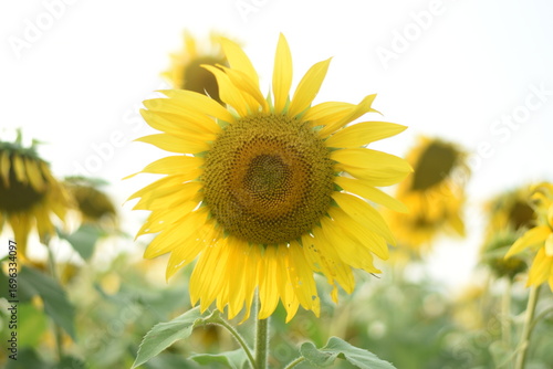 Fototapeta premium Sunflower's Glory: A close-up shot of a vibrant sunflower basks in the warm glow of the sun, set against a backdrop of a field of yellow flowers, evoking a sense of warmth and beauty