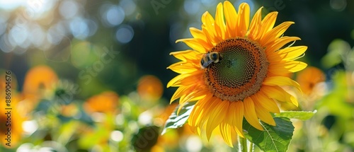 Fototapeta premium Sunflower Serenade: Bumblebee Collecting Nectar from Vibrant Bloom in Sunny Garden