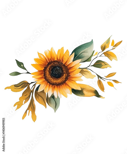 © Daryl, Fototapeta premium Sunflower watercolor PNG with green leaves. Transparent background illustration for rustic wedding designs, invitations, and summer events