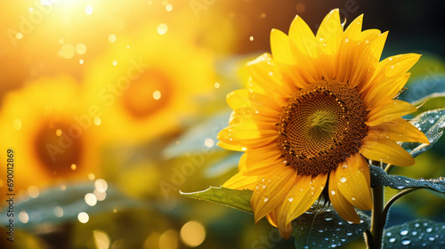 Naklejka premium Sunflower with water drops on the petals. Sunflower natural background.