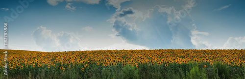 © pavlobaliukh, Obraz premium sunflowerfield under a dramatic sky with dynamic textured clouds.