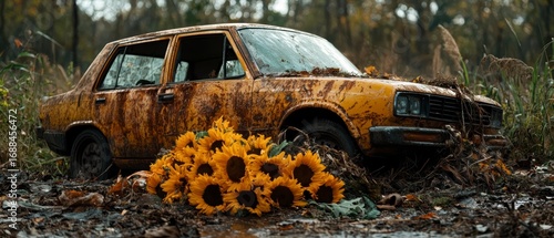 Fototapeta premium Sunflowers and Abandoned Rusty Car in Autumn