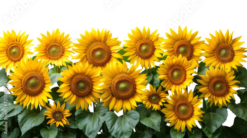 © Areerat, Fototapeta premium Sunflowers and green leaves for decoration of art frame wallpaper, card and banner on transparent background.