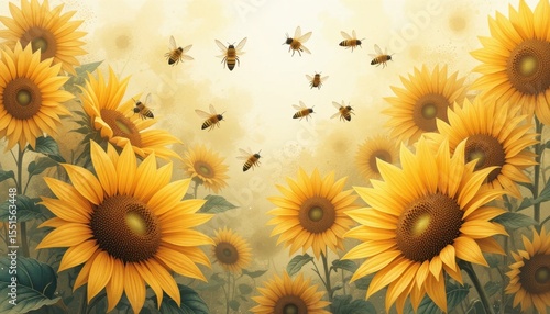 © INVITO ARTE, Fototapeta premium Sunflowers Bloom in Golden Light as Bees Gather Nectar in a Vibrant Field