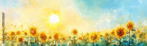 Obraz premium Sunflowers bloom under a bright sun in a vibrant watercolor landscape during...