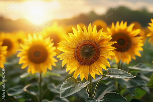 Fototapeta premium Sunflowers blooming at sunset in a vibrant field of gold