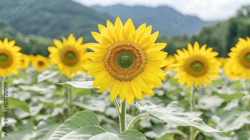 © Bella, Fototapeta premium Sunflowers blooming in mountain field, summer