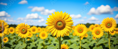 © Yury, Fototapeta premium Sunflowers blooming joyfully against a bright blue sky