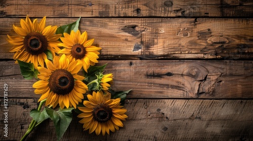 Obraz premium Sunflowers displayed on rustic wood backdrop Floral backgrounds