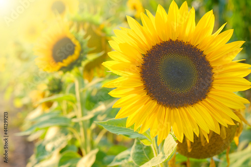 Fototapeta premium Sunflowers field in the sun.Blooming yellow sunflowers in the rays of the sun. Farm plants. Agriculture and farming.