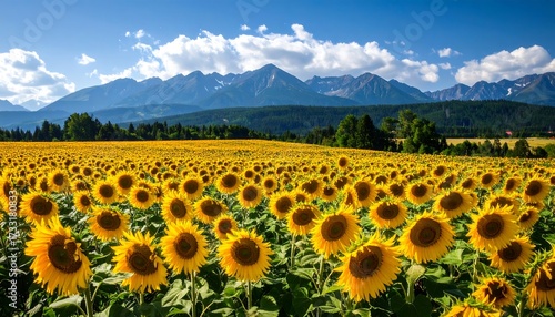 © BAKSO, Obraz premium Sunflowers field, mountains backdrop