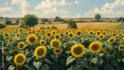 © nawang, Obraz premium Sunflowers field under a partly cloudy sky
