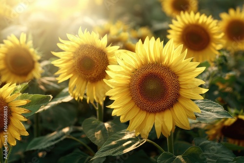 Fototapeta premium Sunflowers in a field, bathed in golden sunlight