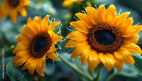 © Bernard Chantal, Fototapeta premium Sunflowers in Full Bloom with Dew Drops