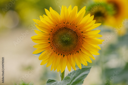 Fototapeta premium Sunflowers in the field and close up of sunflower.