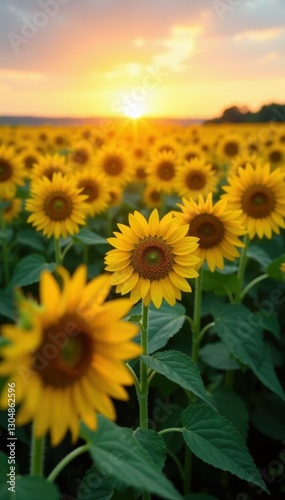 Fototapeta premium Sunflowers in vast field, golden heads east, dawn light , blossoms, yellow