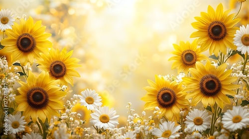 © ThuyTrang, Fototapeta premium Sunflowers in vibrant yellow tones and pure white daisies arranged along the edges, central blank area with a soft cream background for text, softly diffused sunlight, hd details,
