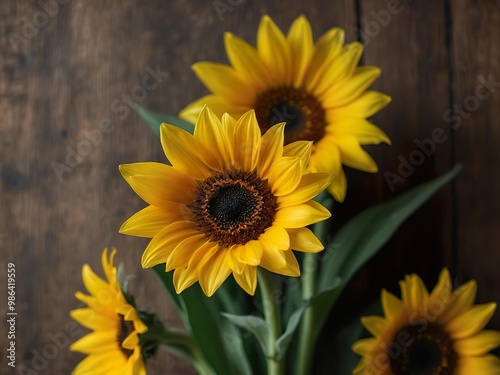 © dave958, Fototapeta premium sunflowers on a wooden background