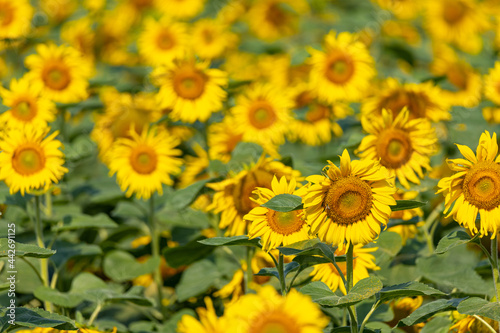 Naklejka premium Sunflowers on the field closeup. Authentic farm series.
