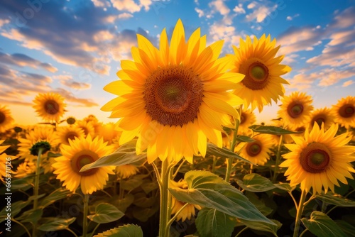 © MdHafizur, Obraz premium Sunflowers turning toward the sun in the soft morning light.
