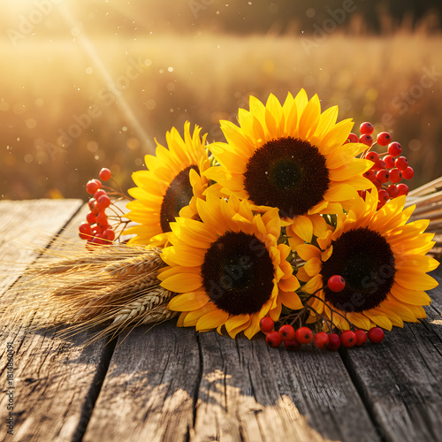 Obraz premium Sunflowers wheat and berries on a rustic wooden table