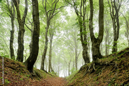 © AVTG, Fototapeta premium Sunken Lane through Foggy Natural Forest of Gnarled Beech Trees in Spring