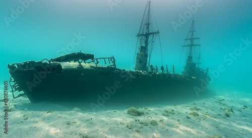 Fototapeta premium sunken old ship under the sea with good lighting in high resolution with clear water