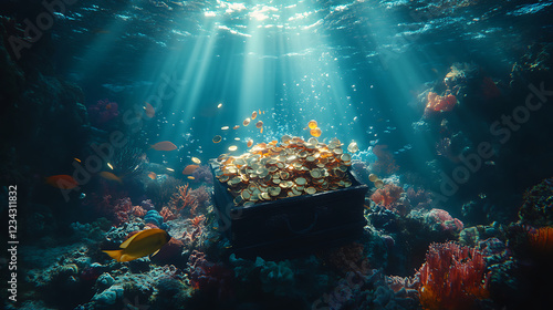 © Abul, Fototapeta premium Sunken Treasure Chest in Vibrant Coral Reef