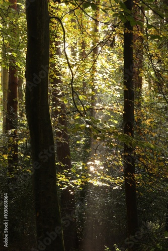 © Andrew, Fototapeta premium Sunlight against autumn forest leaves