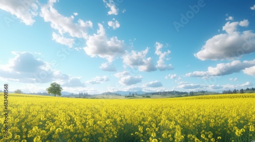 Obraz premium Sunlight and scattered clouds above a blooming canola paddock .