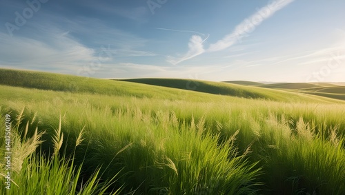 © yollo, Fototapeta premium Sunlight bathes the beautiful green field of wheat under a vast blue sky with scattered clouds, a quintessential summer countryside landscape