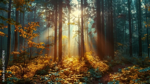 Obraz premium Sunlight Beaming Through a Dense Forest with Lush Greenery