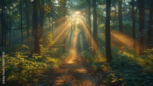 Fototapeta premium Sunlight Beaming Through Forest Trees - Generative AI