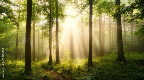 © YanabY, Obraz premium Sunlight beams filtering through tall trees in a serene forest at dawn