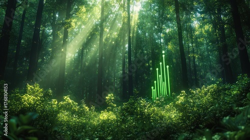 Naklejka premium Sunlight beams piercing through a dense green forest with glowing abstract green light structures among the foliage, evoking a sense of mystery and tranquility
