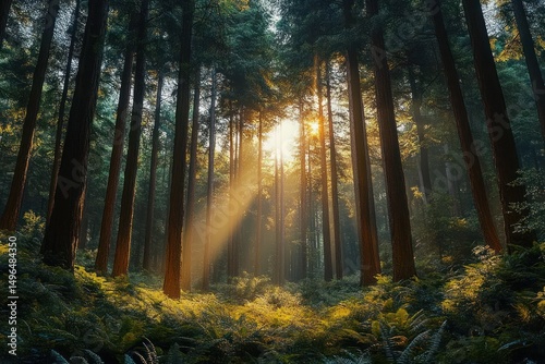 Naklejka premium Sunlight beams piercing through dense tall trees illuminating lush green forest floor covered with ferns creating a serene and magical atmosphere