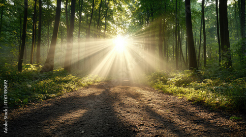 Fototapeta premium Sunlight beams shining through trees in serene forest trail, creating magical...