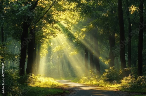 © Rgrd, Fototapeta premium Sunlight beams streaming through tall trees onto a forest path surrounded by lush green vegetation, creating a serene and peaceful atmosphere