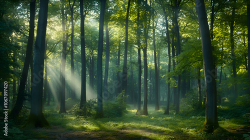 © Lailatul, Fototapeta premium Sunlight beams through a dense forest, illuminating the trees and foliage.