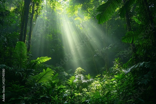 © Creative, Obraz premium Sunlight beams through a vibrant lush green tropical rainforest scene