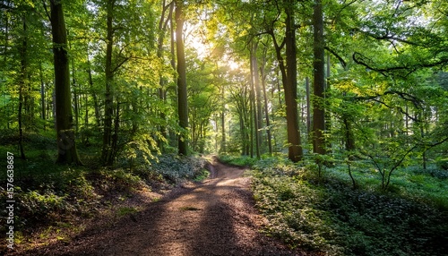 Fototapeta premium sunlight beams through dense forest canopy onto a dirt path in a lush green woodland scene