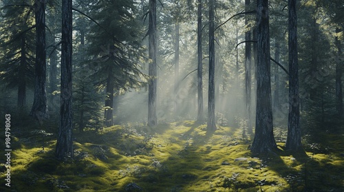 © Jari.art, Obraz premium Sunlight beams through dense forest trees