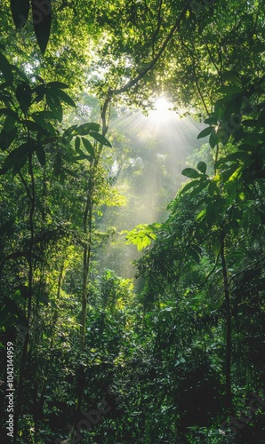 Naklejka premium Sunlight beams through dense green rainforest canopy.