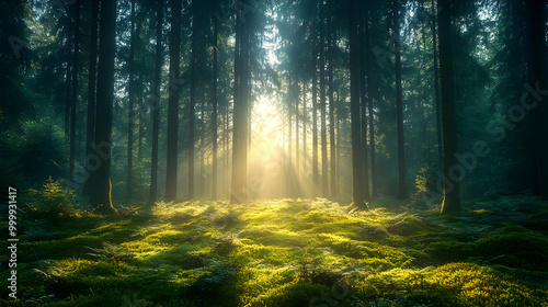 © Siasart Stock, Obraz premium Sunlight Beams Through Forest Trees, Creating a Mystical Atmosphere