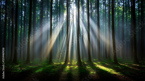 Obraz premium Sunlight Beams Through Forest Trees with Green Moss and Shadows Forming a...