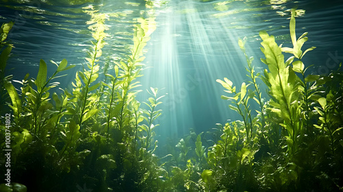 Fototapeta premium Sunlight Beams Through Lush Underwater Seaweed Forest