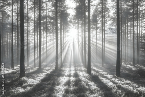Fototapeta premium Sunlight Beams Through Misty Forest