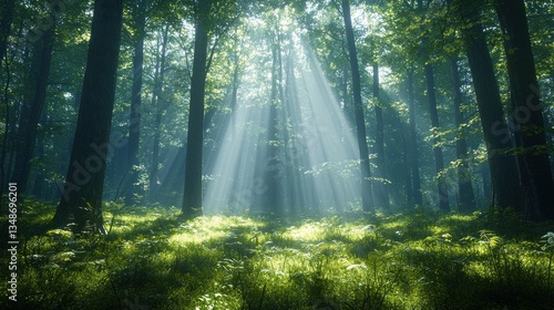 © Alesha, Fototapeta premium Sunlight beams through misty forest floor