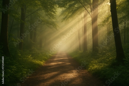 © Rosi, Fototapeta premium Sunlight Beams Through Misty Forest Illuminating a Serene Woodland Path
