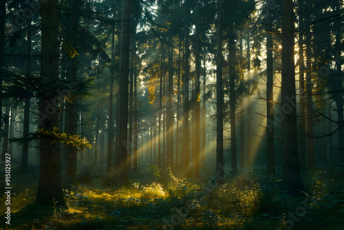 Obraz premium Sunlight Beams Through Misty Forest Trees Photo